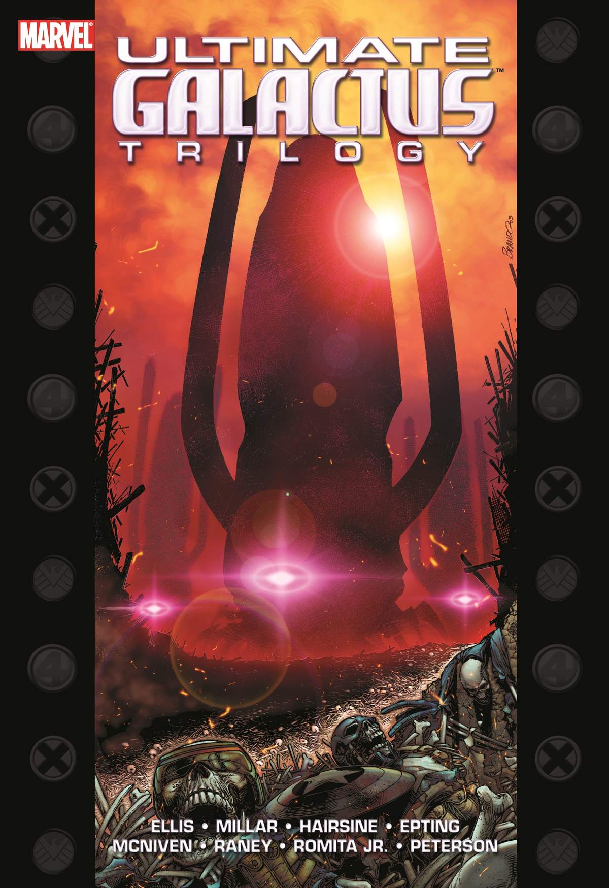 Super-scribe Warren Ellis chronicles the coming of Gah Lak Tus! This deluxe hardcover collects the entire Ultimate Galactus trilogy - ULTIMATE NIGHTMARE, ULTIMATE SECRET and ULTIMATE EXTINCTION - plus extras. In Ultimate Nightmare, world communications systems break down, and the source of the anomaly is revealed as Tanguska, Russia. Nick Fury of S.H.I.E.L.D. leads a force comprised of Captain America, Black Widow and Sam Wilson to investigate; simultaneously, Charles Xavier of the X-Men dispatches his own team consisting of Jean Grey, Wolverine and Colossus. What they discover there - and what happens next - defies belief! In Ultimate Secret, a hidden alien race is trying desperately to keep man from reaching the stars. Cape Canaveral scientist Phillip Lawson, secretly a Kree soldier assigned to a mission on our planet, knows of the hideous plan and will use all his considerable power to stop it...the power of Captain Mahr Vehl! But his sudden betrayal may mean a swift doom for the Earth. Starring the Ultimates and the Ultimate Fantastic Four! And finally, in Ultimate Extinction, it's time for the coming of Gah Lak Tus! And his arrival could mean the end of all life on this planet! Not even the power of S.H.I.E.L.D. or the brilliance of Fantastic Four leader Reed Richards seems able to stop its inexorable march to Earth. What role do the Ultimate X-Men have in this drama? And who on Earth is Misty Knight and how does she know the fate of our world may rest with - Ultimate Silver Surfer? Collecting ULTIMATE NIGHTMARE #1-5, ULTIMATE SECRET #1-4 AND ULTIMATE EXTINCTION #1-5.