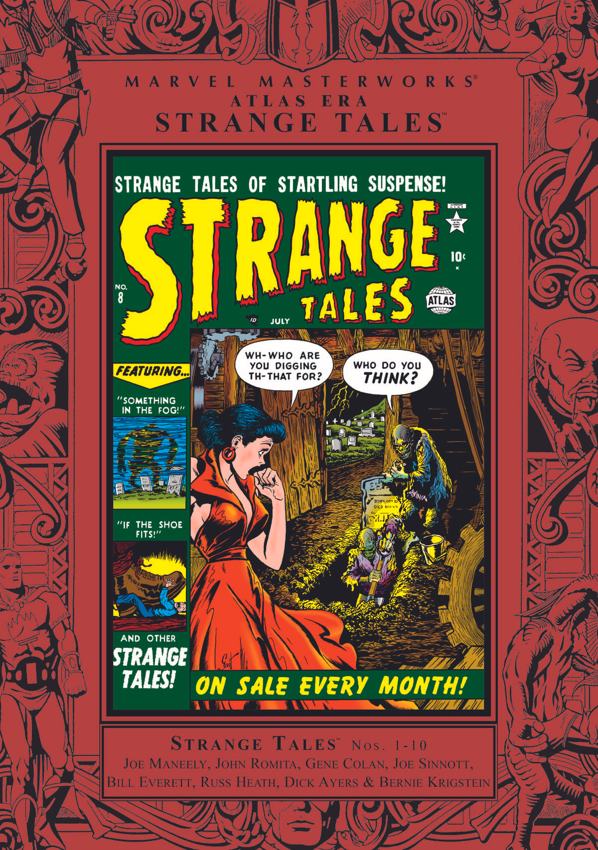 Collects Strange Tales #1-10. Prepare yourself for a haunted Halloween full of pre-Code horror courtesy of the Marvel Masterwork's Atlas Era! We're turning the clock back to 1951, the time when horror reined supreme in comics. These spooky stories of ghosts, ghouls, monsters, morgues, vampires, and more than just a few terrors-that-dare-not-speak-their-names aren't just some of the most frightening tales ever published, they're also by a frightening array of star comic-book talents! See why Gene Colan says "He Wished He Was a Vampire;" Look out when Bill Everett gives "The Evil Eye;" Come along as Russ Heath finds a planet that may, or may not, be "Uninhabited;" Prove to Bernie Krigstein if you were "The Boy Who Was Afraid," and to stand in shock and amazement at the bevy of stories lurking just around the corner by Stan Lee's right-hand man of the '50s, comics great Joe Maneely!