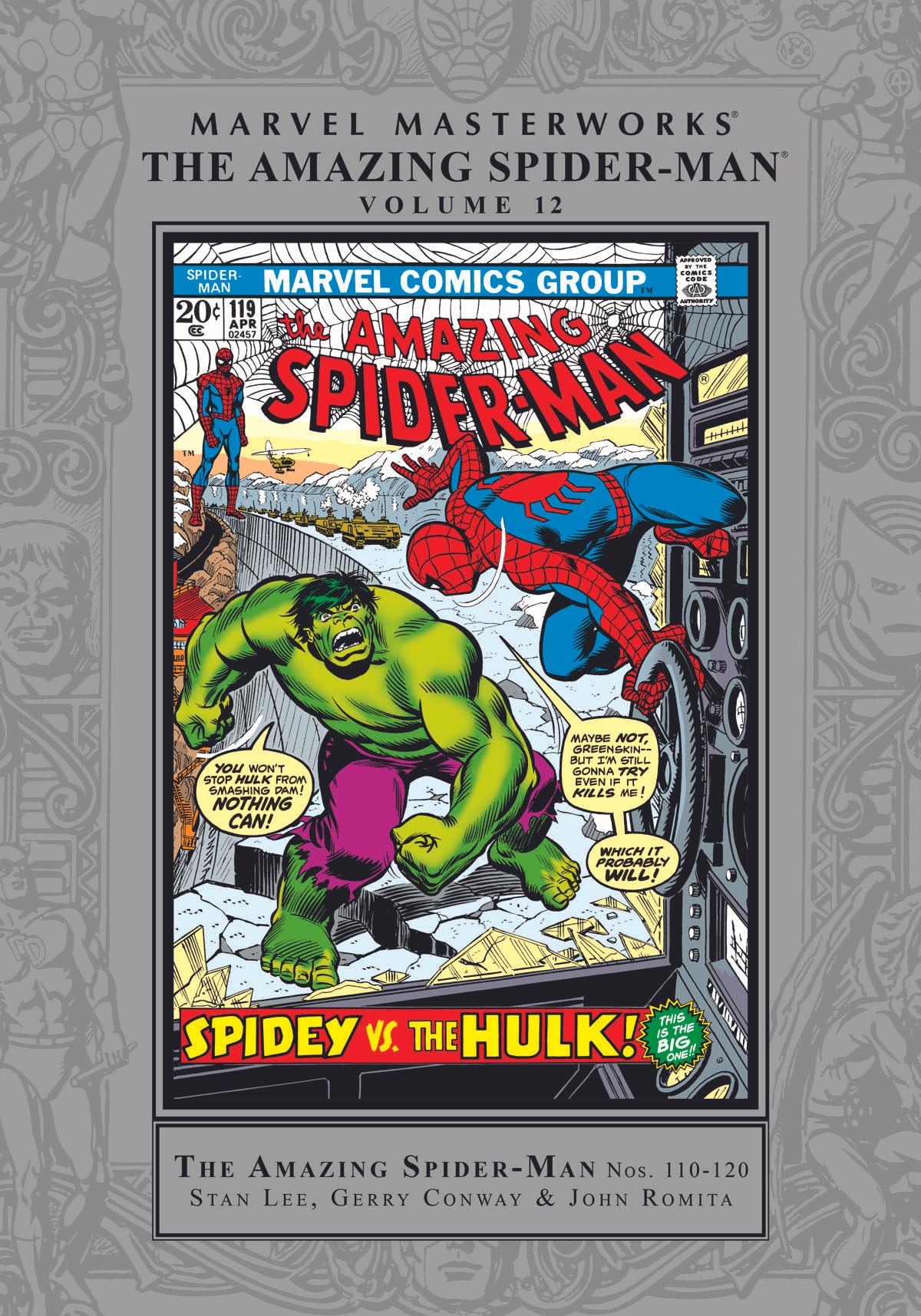 The tension-torn adventures of comics' most put-upon super hero, the Amazing Spider-Man, continue in another round of Marvel Masterworks classics! Stan Lee kicks it off with one of his craziest creations of all time, the Gibbon. And when that bestial baddy teams up with the vengeful Kraven the Hunter-well, it's enough excitement to give a hero an ulcer-and it does! Then, words between Peter's lovely gal Gwen and Aunt May push his doting aunt out of his life and into the arms of-an octopus! Doc Ock returns to do in Spidey, but with Hammerhead, the only gangster with more steel in his dome than in his gun, waging a turf war to take over the city it's open season on spiders! Always a man of the people, Spidey uncovers the machinations of a mayoral candidate who's not quite what he seems. Let's just say there's no doubt Richard Raleigh put the "action" in political action, alright? And topping it off comes a knuckle-busting, knock-down, drag-out fight between Spider-Man and the Incredible Hulk that's one for the ages! Collecting AMAZING SPIDER-MAN #110-120.