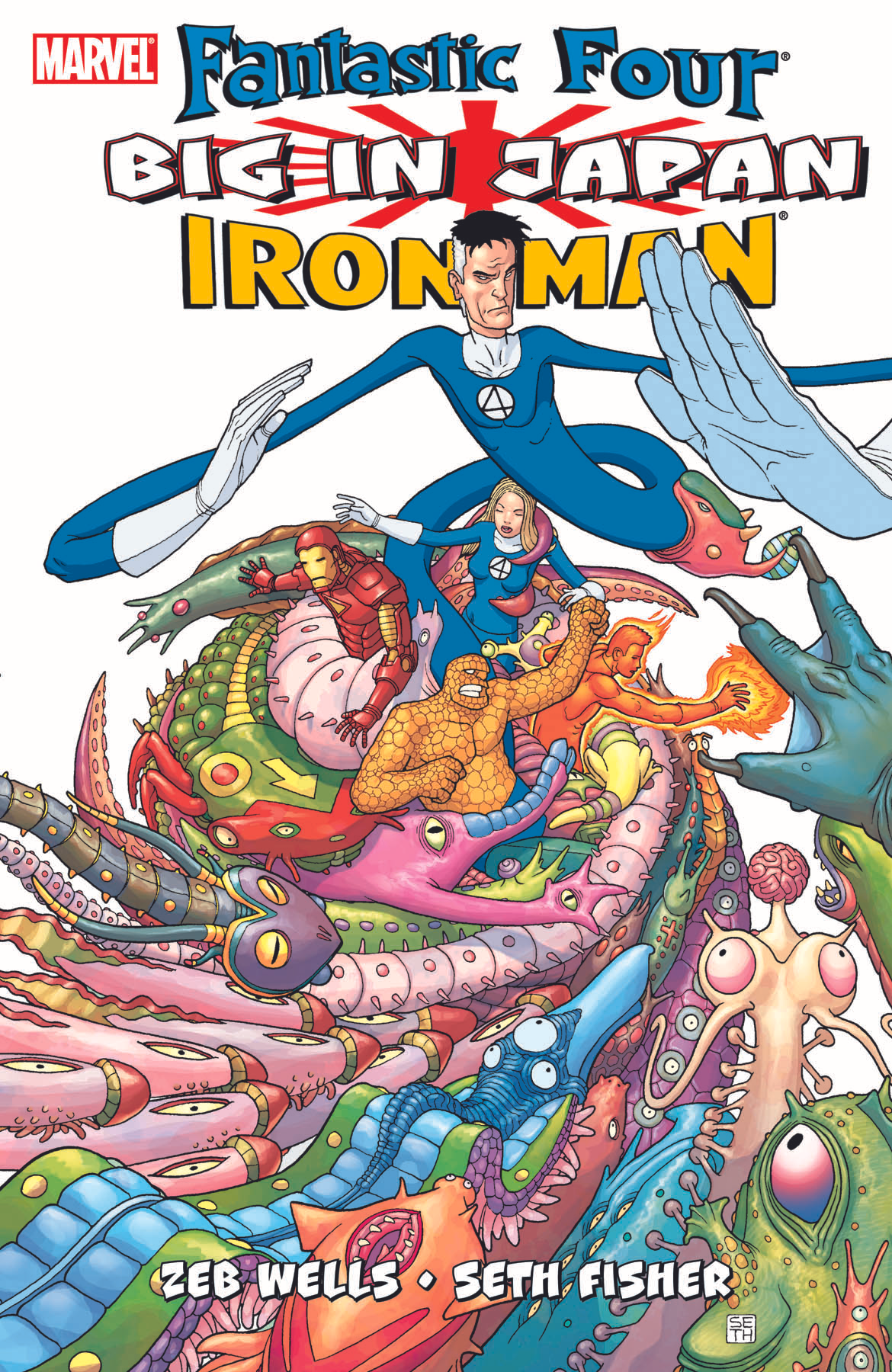 Collects Fantastic Four/Iron Man: Big In Japan #1-4 and material from Spider-Man Unlimited #8. Mass panic has struck the streets of Tokyo! The media has initiated round-the-clock coverage. Uncontrollable crowds are choking the streets, and kaiju hysteria has gripped the island of Japan for the first time in 50 years! Because the Fantastic Four, the world's first super-hero big-monster battling squad, and playboy industrialist Tony Stark have descended on the Land of the Rising Sun! Zeb Wells (NEW WARRIORS, SPIDER-MAN/DOCTOR OCTOPUS: YEAR ONE) and Seth Fisher (Green Lantern: Willworld, Batman: Legends of the Dark Knight) bring you a manic fusion of Marvel super heroes with Japanese pop culture that proves why the FF and Iron Man are big in Japan! It's an all-out romp with big monsters a-go-go as Droom, Giganto and Eerok, the giant ape -- along with hundreds of manic '50s Marvel monsters -- trample Tokyo's first-ever Kaiju Museum and Celebration!