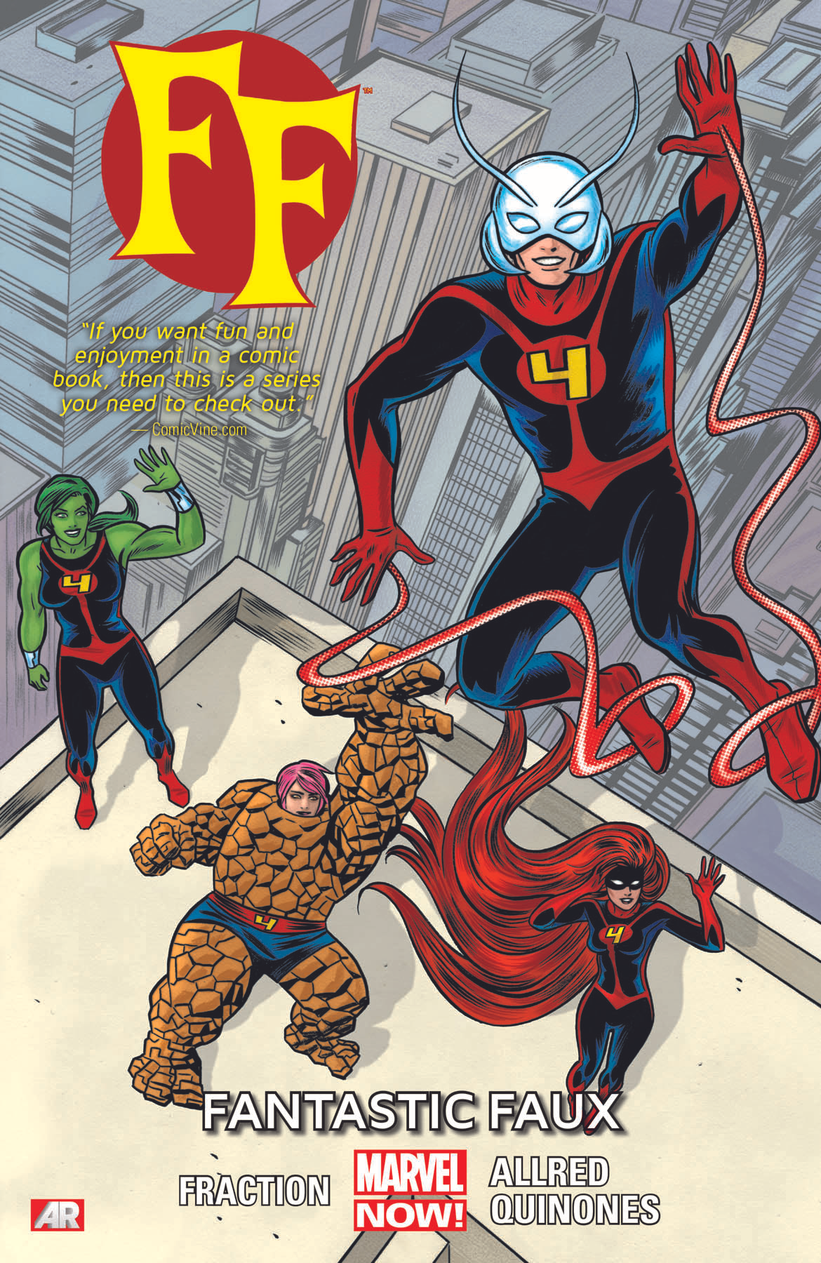 The Fantastic Four have formed a new team to guard the planet - and their wards in the Future Foundation - while they're on an interdimensional journey: Scott Lang, the incredible Ant-Man! Jen Walters, the original She-Hulk! Medusa, queen of the Inhumans! And...Ms. Thing?! But how does the world respond when the new FF makes its debut? And how does Yancy Street respond to a new Thing? Then, it's Valentine's Day at the Baxter Building! So why does that spell trouble for She-Hulk? Plus: Ant-Man has already lost a daughter, so watch what happens when he puts it all on the line to save Bentley-23! Learn the identity of the villain pulling the strings and pitting family against family as the FF undertakes a rescue mission into the Negative Zone! Dynamo creators Matt Fraction and Mike Allred reinvent Marvel's First Family...NOW! Collecting FF (2012 ) #4-8.