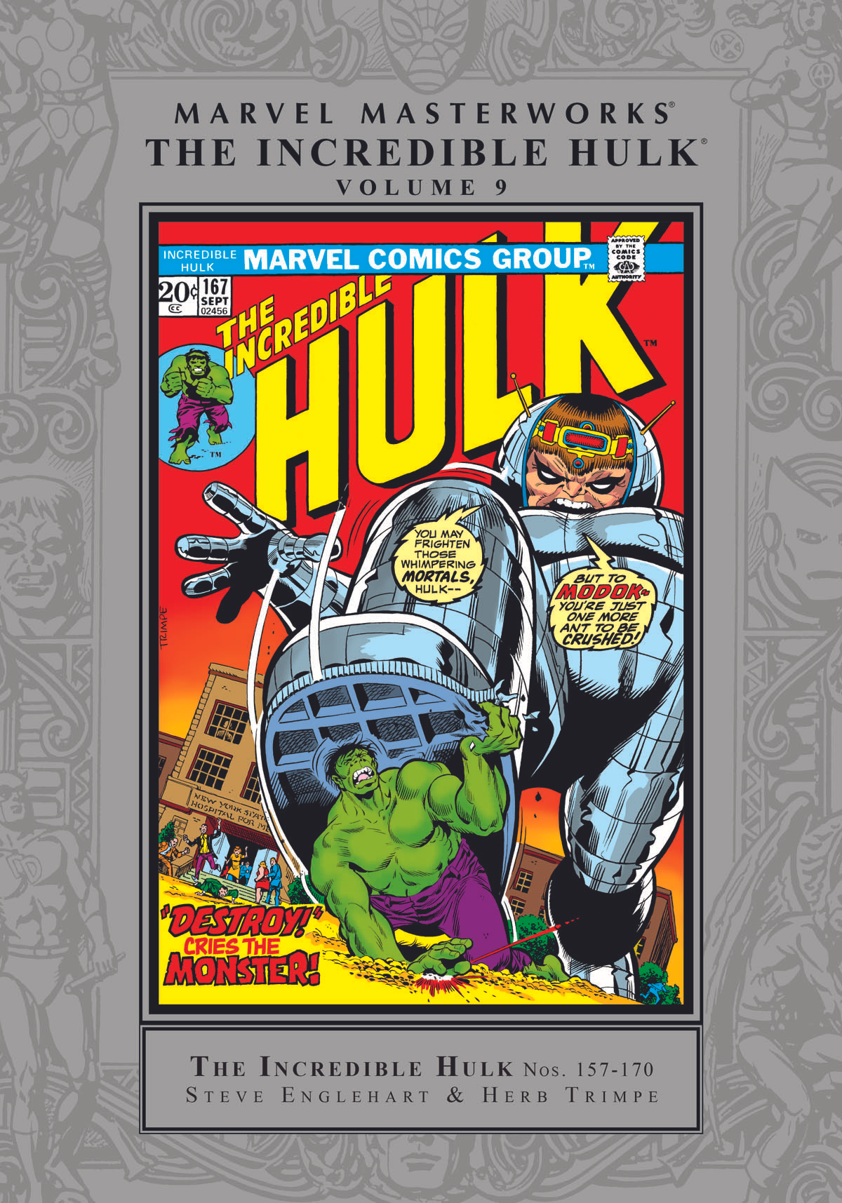Collects Incredible Hulk (1968) #157-170. Artist Herb Trimpe is joined by writer Steve Englehart for another Hulk-sized Marvel Masterworks edition! But first, a trip to Counter-Earth, where Hulk confronts his most-hated enemy: Bruce Banner! Add in the Rhino and the Abomination, and the action and drama can't be contained! Then, Hulk heads for Canada where the X-Men's Mimic returns, and the Wendigo makes his first appearance! And Hulk's travels will take him both over land and undersea until he returns to the United States to unleash his vengeance on General Thunderbolt Ross! When the malevolent M.O.D.O.K. mutates Betty Ross into the Harpy, Hulk must save her - even if she's now married to Glenn Talbot - in an adventure that ends like every Hulk story ought to: with the green goliath battling giant monsters!