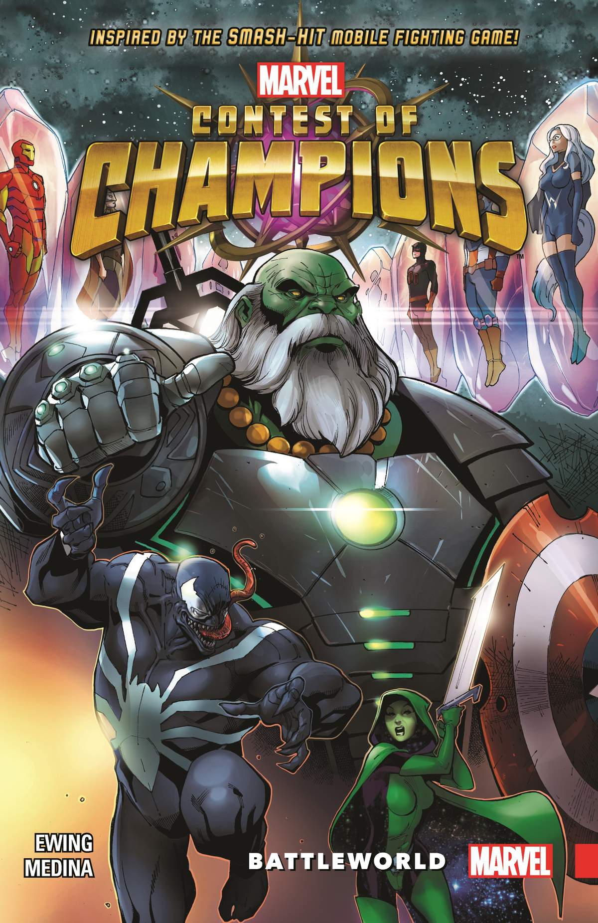 You've played the game, now watch the action play out across page after page of super hero showdowns! Welcome to the Battlerealm - a broken section of space-time where cosmic beings gamble for ultimate power using unwilling pawns drawn from across the multiverse. Your favorites must fight for their lives and a chance to return to their Earth. Iron Man! Venom! Gamora! Ares! Plus sensational breakout stars-in-waiting like Outlaw, White Fox and the Guillotines! And don't miss the incredible battle between the man who trained Daredevil and the woman who loved Matt Murdock: Stick versus... Bullseye?! But what roles in this celestial game are the Collector and the Maestro playing? And, the biggest question of all - who will survive the Contest of Champions?
