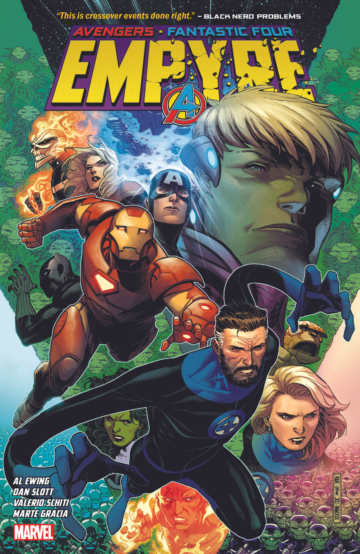 Collects Empyre #0 Avengers (2020), Empyre #0 Fantastic Four (2020), Empyre (2020) #1-6, Empyre Aftermath: Avengers (2020) #1, Empyre Fallout: Fantastic Four (2020) #1. An intergalactic event that will reshape the Marvel Universe! Old allies make a distress call to the Avengers with news of a terrible enemy that could wipe out humanity. Meanwhile, in the most unlikely of places, the Fantastic Four witness the final conflict of the Kree/Skrull War — and a long-hidden Elder of the Universe stands revealed! With the Kree and Skrulls united under a new emperor, their war fleet charts a course — for Earth! The Avengers are ready to fight, while the FF seek a diplomatic solution. But if they can’t work together, the world may not survive. Either way, both teams will be tested as never before! The new Marvel Space Age begins here!