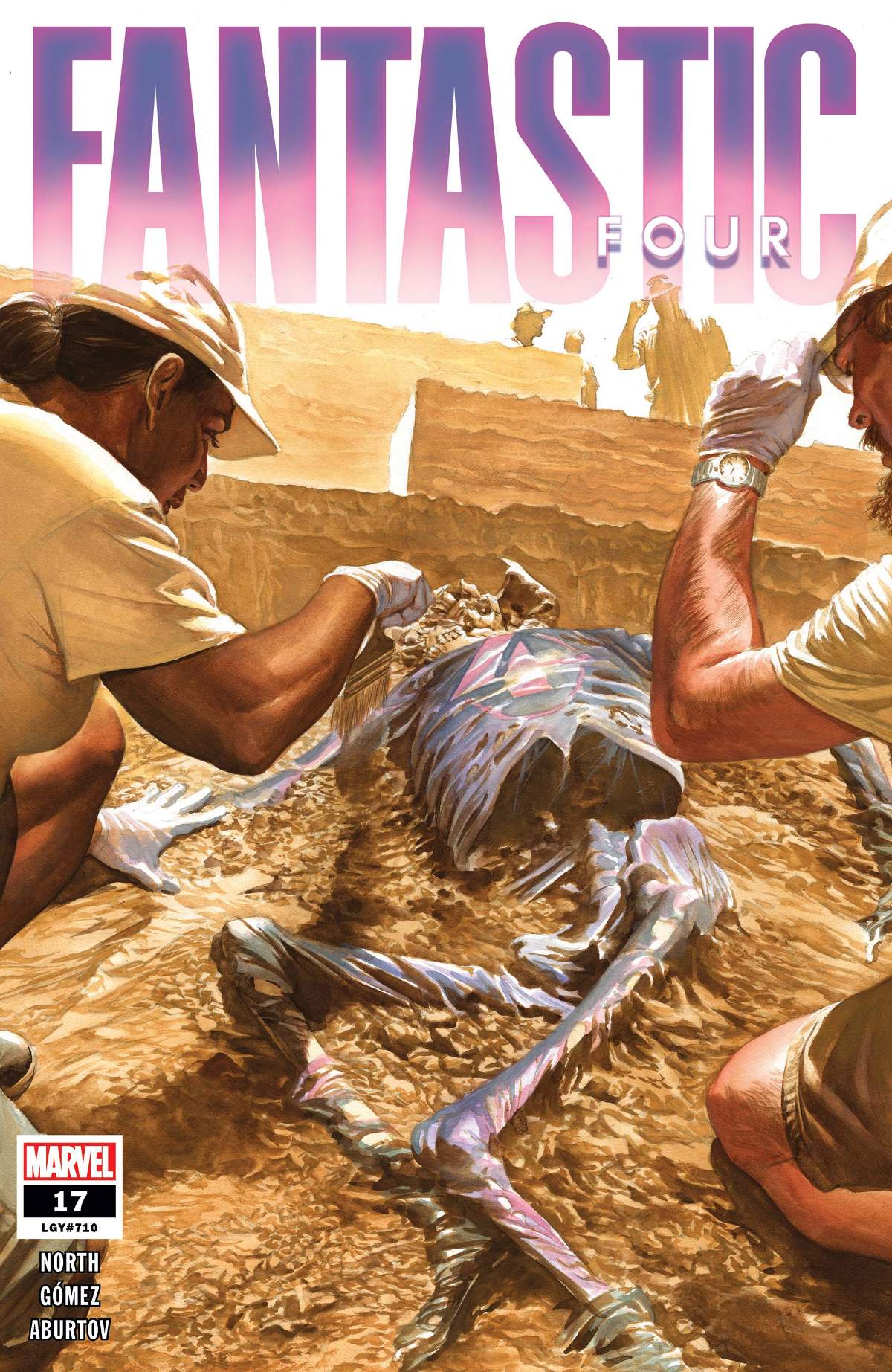 When construction unearths something unexpected, Susan Storm is called in - not as a super hero but an archaeologist! But when the bones she uncovers - tens of thousand of years old, dating back to the first arrival of humans in the Americas - turn out to be female...and matching her build...and wearing the shredded and decayed remains of what appears to be BLUE FABRIC constructed of unstable molecules, she must accept the fantastic: Dr. Susan Storm is going to DIE deep in Earth's prehistory... ...and that time is coming sooner than she might think! Also in this issue: an anniversary date for Reed and Sue! So Sue gets both inarguable evidence of her own death AND some romance.
