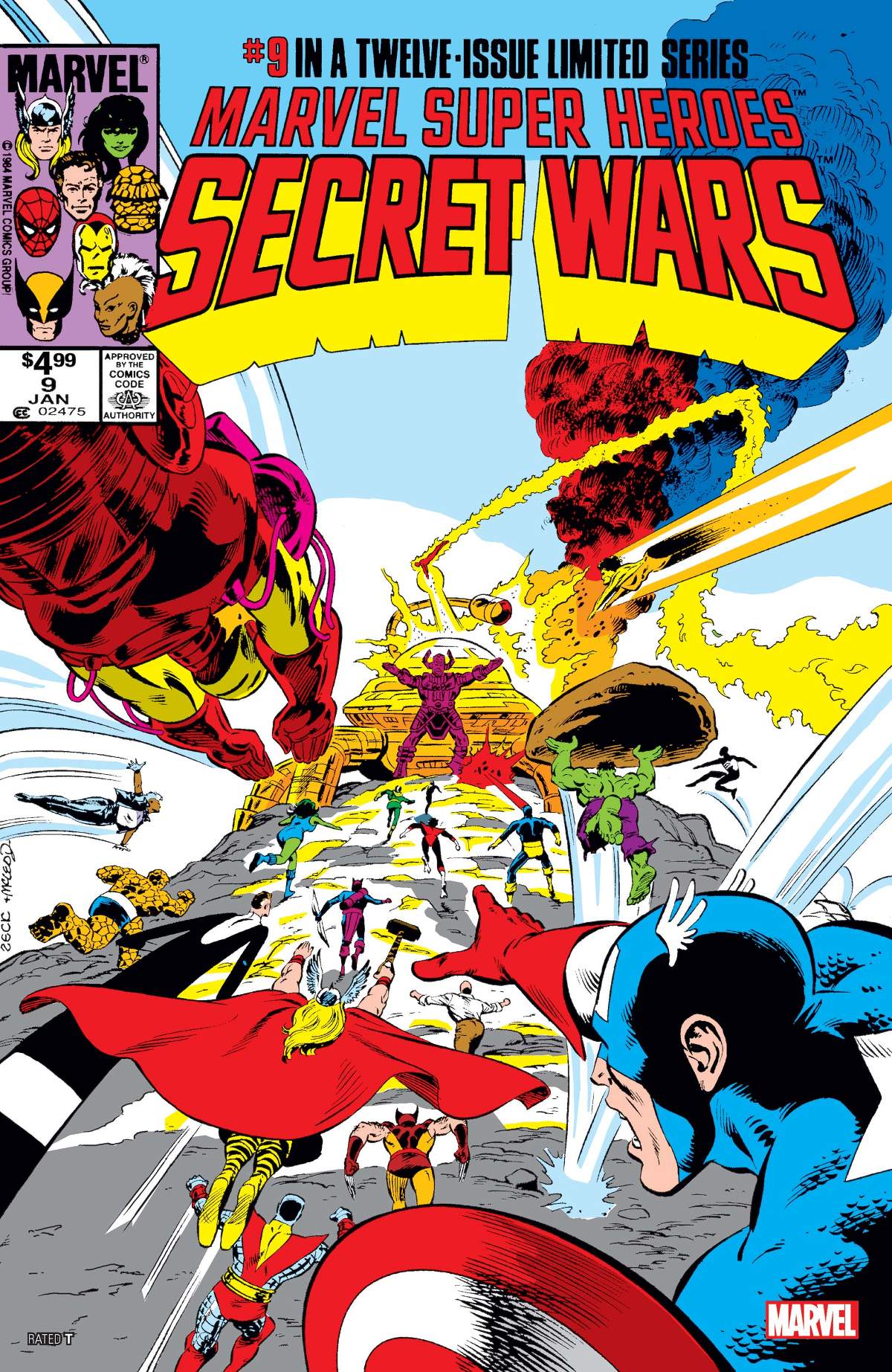Marvel's monthly celebration of the finest super-hero crossover of them all continues with Battleworld about to be consumed by Galactus! Spider-Man is back in action and learning all the fresh tricks at his disposal courtesy of his new black costume - but his excitement might be short-lived as the assembled heroes, reunited with the X-Men, must mount an assault on the World-Eater with everything at stake! But is stopping Galactus even the right thing to do? Reed Richards isn't certain - and if he doesn't know what to do, what chance does anyone have? It's one of the all-time great Marvel comic books, boldly re-presented in its original form, ads and all! Reprinting MARVEL SUPER HEROES SECRET WARS #9.