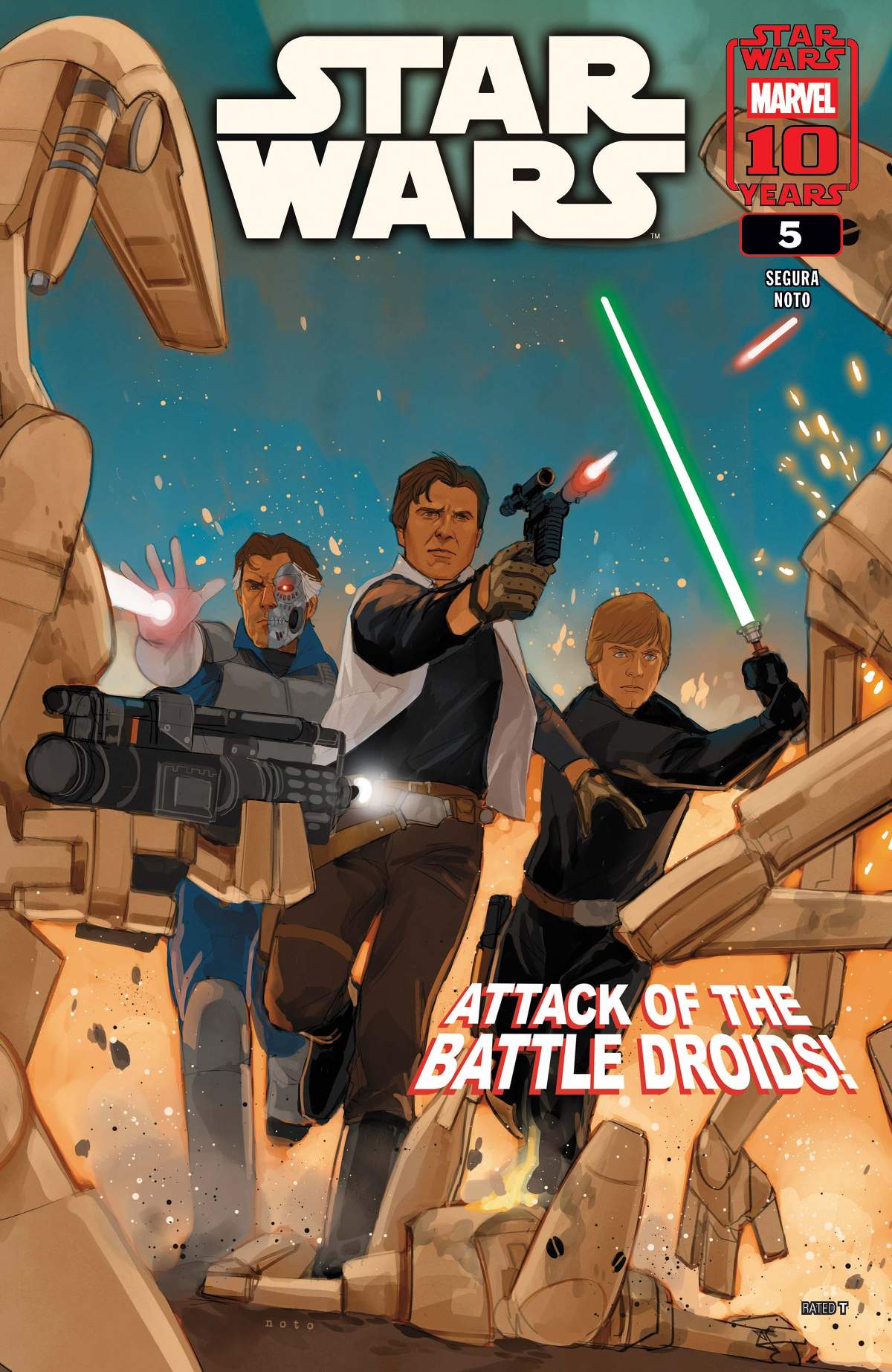 THE PAST RETURNS! As LUKE, RYNN, HAN and VALANCE race to find a group of stranded traders - they uncover a startling, and deadly, relic from the past - and have to face off against a horde of BATTLE DROIDS! LEIA and MON MOTHMA face an unexpected and powerful attack! Who is the new leader of the Nagai resistance? Cornered on a desolate planet, our heroes are left with one shocking option to survive!