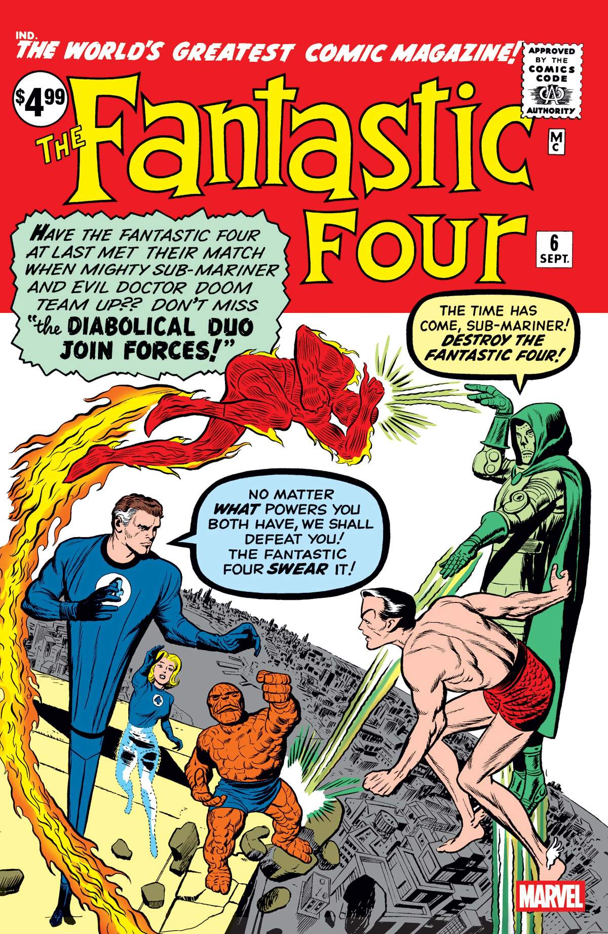 The newly formed Fantastic Four barely withstood their first encounters with each of their powerful enemies, Doctor Doom and the Sub-Mariner. So what happens when Doom and Namor join forces? Find out as the armored tyrant tracks down the Sub-Mariner in his underseas kingdom, inciting him to seek vengeance on the surface world - and its accursed protectors, the Fantastic Four! But when it comes down to battle, just whose side will Namor be on? It's one of the all-time great Marvel comic books, boldly re-presented in its original form, ads and all! Reprinting FANTASTIC FOUR (1961) #6. Marvel is reprinting the first twelve issues of FANTASTIC FOUR as they originally appeared!