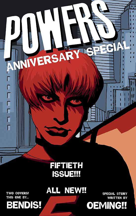ANNIVERSARY SPECIAL EXTRAVAGANZA!!!! Our fiftieth issue!! FIFTIEST!! (If, of course, we hadn't started the renumbering in a very successful move to pander to a larger audience.) But what will this special fiftieth issue entail? A lot. Because you asked for it! how about a short story written by Oeming and drawn by Bendis? How about two covers? One by Oeming and one by Bendis that when put together make one very cool image? How about double sized? How about an exclusive retrospective interview and a giant sized letter column and a couple of contractually obligated house ads? All that and it's a perfect jumping on point for new readers! Homicide Detectives Christian Walker and Deena Pilgrim investigate murders specific to superhero cases. and with all superheroes declared illegal, the city is in chaos. From the writer of some of your favorite marvel comics, (New Avengers, USM, Daredevil, Secret War) comes a brand new chapter from the award winning book!
