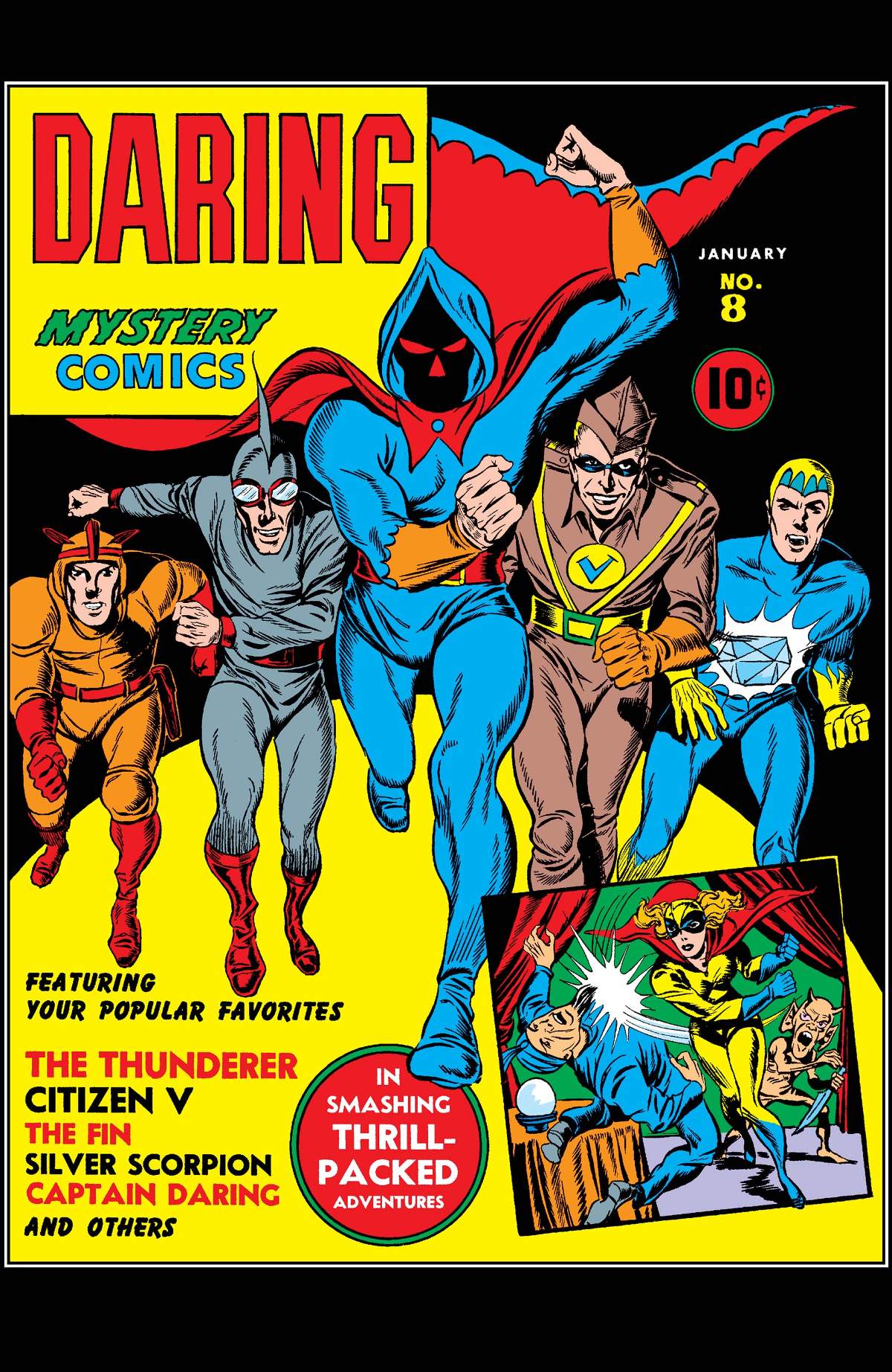 Another hero joins the ranks of Marvel's Golden Age greats -- CITIZEN V! Plus, more tales of Marvel's pioneers like The Thunderer, Silver Scorpion, Captain Daring, and more!