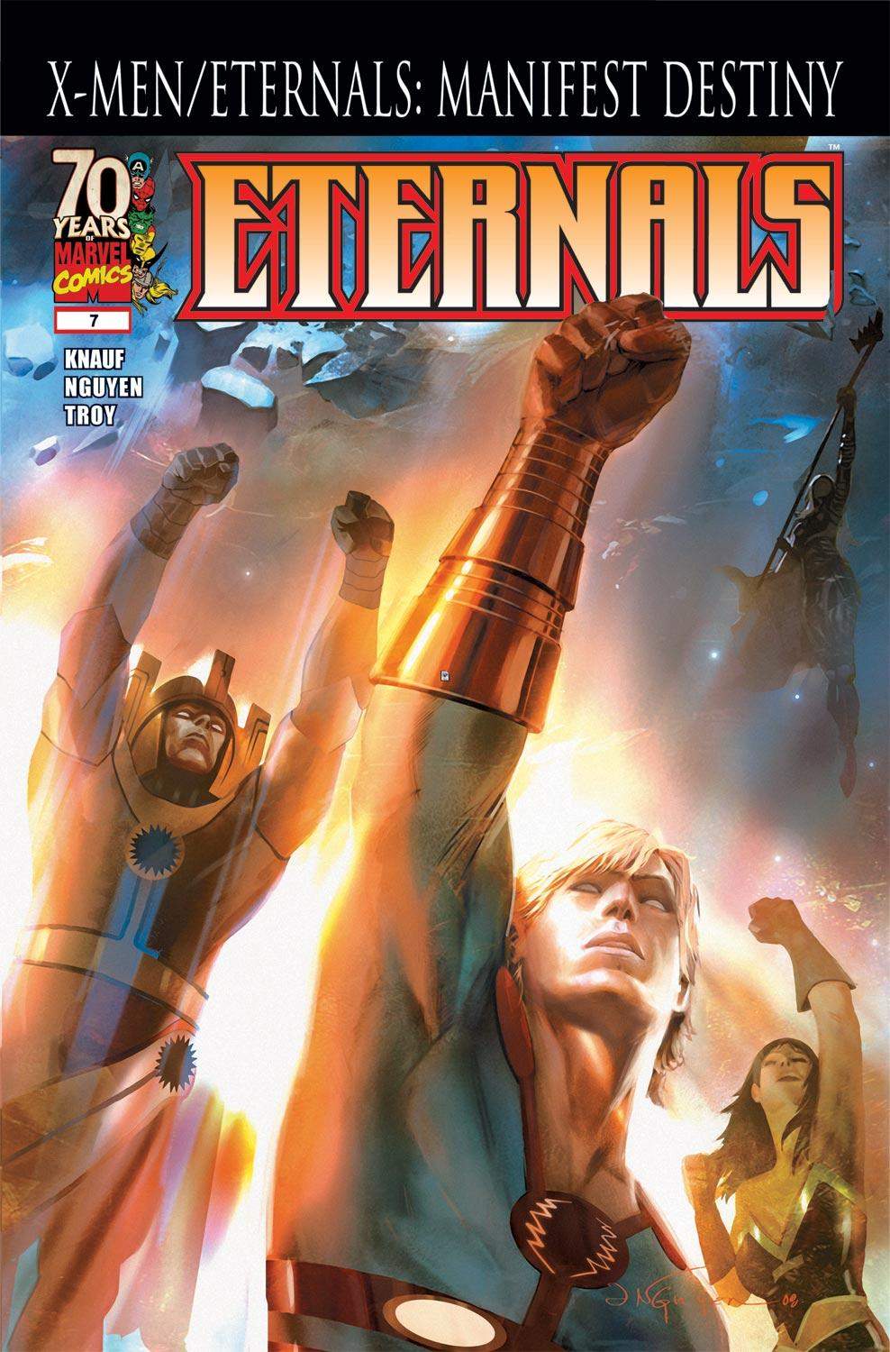 Ikaris makes a huge move as the next arc in our cosmic adventure begins! As the drastically approaching Horde legion moves ever closer to Earth, Druig and Ikaris' ageless hatred towards one another finally explodes! Pacts are broken, alliances are shaped, lines are drawn, and Eternal blood will flow on the Marvel landscape! Don't miss this jumping on point, dear reader, as the goldern-haired Eternal breaks from the pact to become a star!