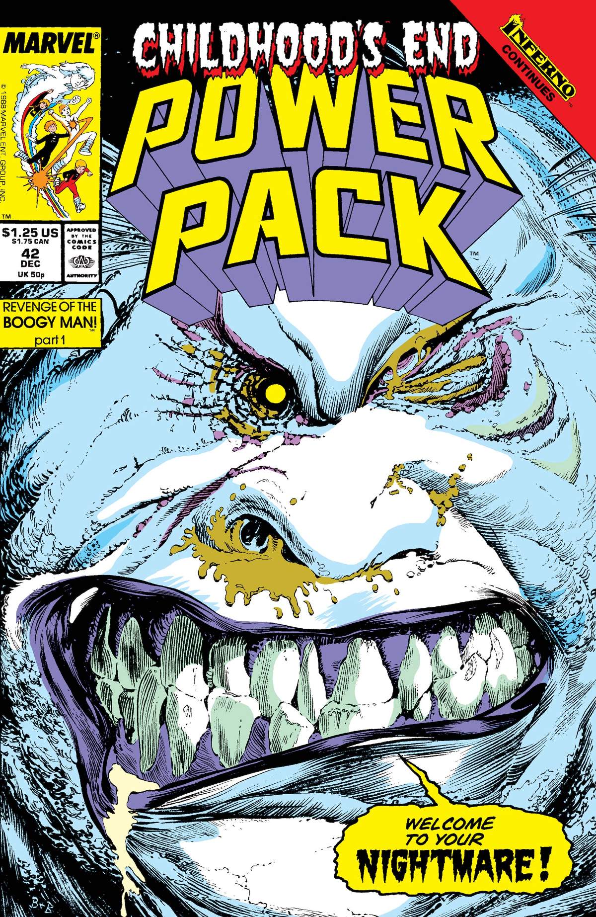 As the Inferno storyline gets under way, the Bogeyman returns from Limbo... as a real Bogeyman! When he takes revenge on Power Pack in front of the kids' parents, it could blow their secret identities forever!