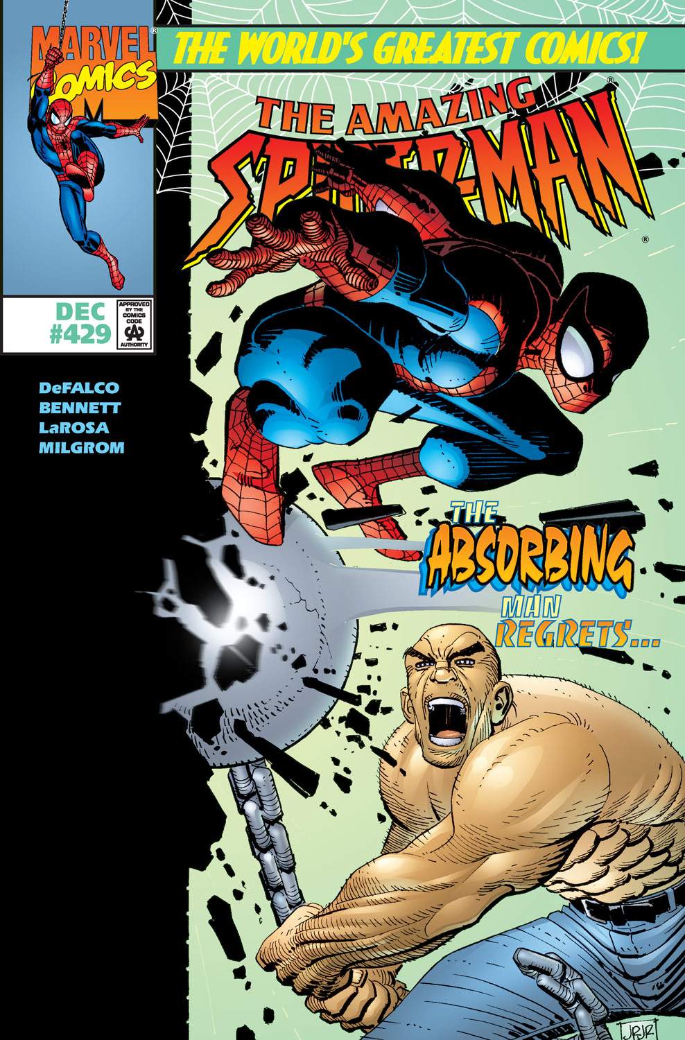 Absorbing Man and Titania disguise themselves as "Lightening Bolt" and "Thundergirl" to find Spider-Man. Spider-man encounters Daredevil and battles the foes only to save Titania after a helicopter crash and helps Absorbing Man surrender. Guest Starring, The Man with No Fear: Daredevil
