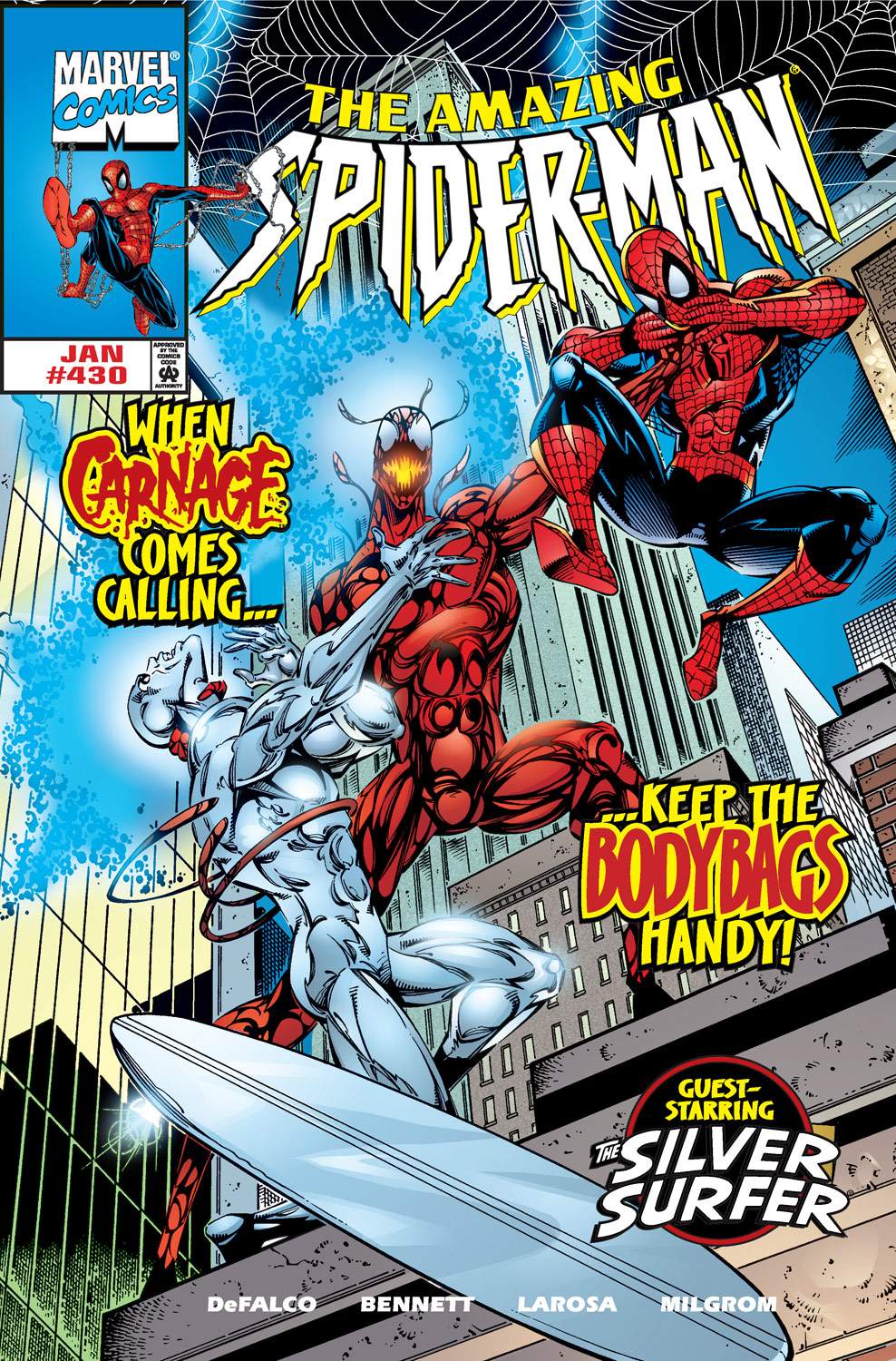 Carnage is on the rampage, and only Spider-Man stands in his way! Luckily, Peter Parker doesn't stand alone, thanks to the arrival of the Silver Surfer! But what secret history does the Surfer have with the symbiote?